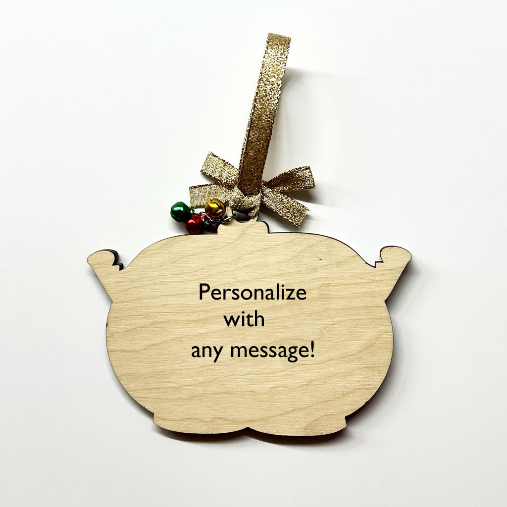 Finished with a gold ribbon loop and jingle bells ready for hanging.