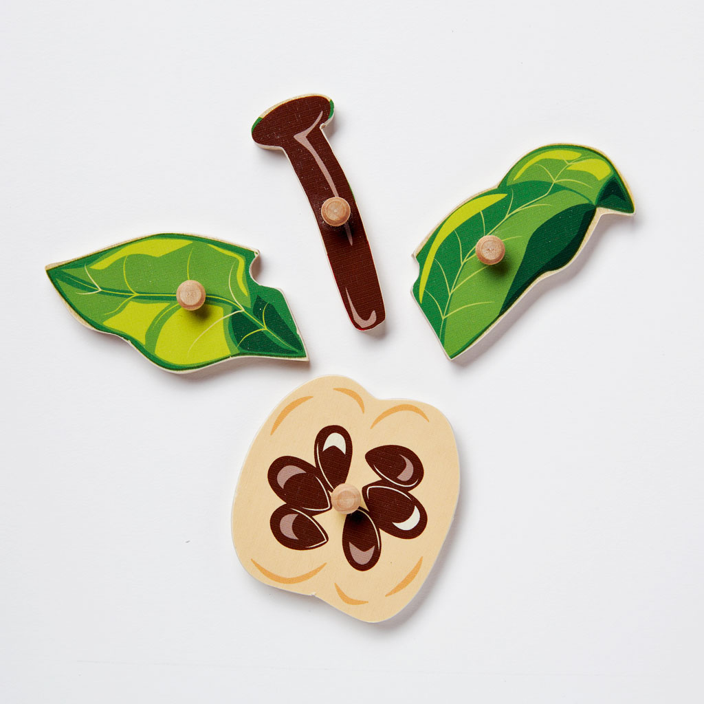 The knobs used on wooden puzzles are important features that are designed to encourage the development of the pincer grip. The pincer grip is the action of grasping an object with the thumb and first finger.